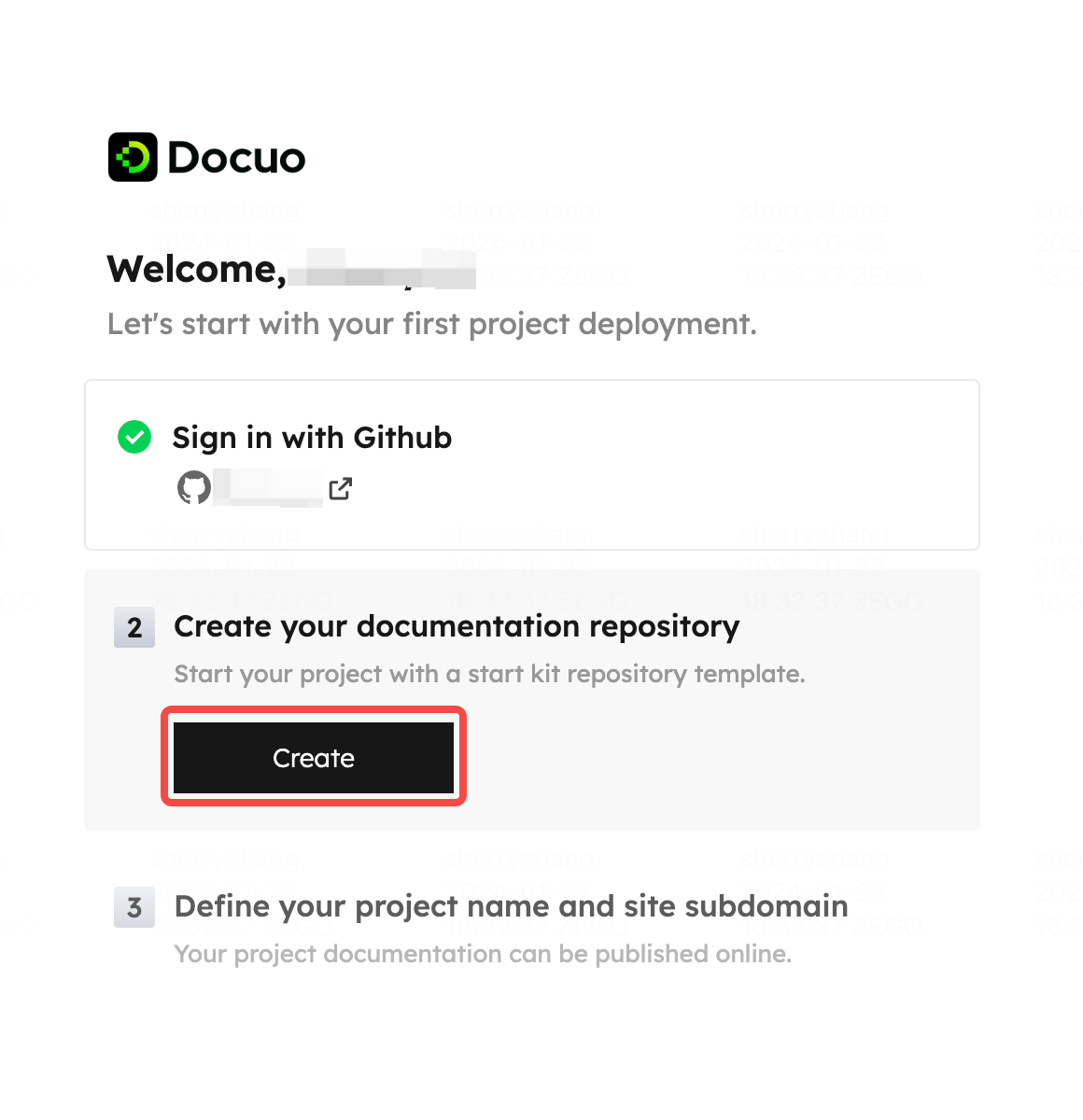 - Clone template repository to your Github On the next step, you'll create your first repository for your project. We've prepared template repository for you. This will help you get started faster and edit content you want to publish with ease. Hit "Create", Docuo public template repository will be cloned to your own Github, which you can find in your git repository list. After successfully cloning the template repository, we also prepare updating guide for you.