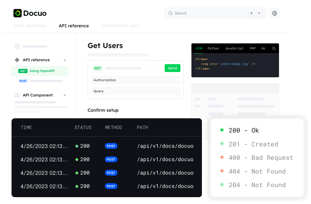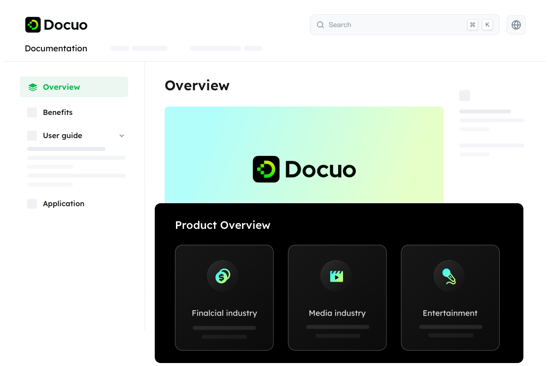 You can use Docuo platform to effortlessly transforms your static contents into a modern developer hub, API reference, product guides, and more.