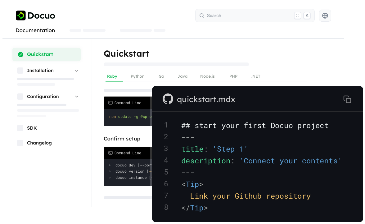 Docuo is a lightweight platform that can seamlessly convert your static content into dynamic and modern developer hub, API reference, product guides, and other varieties of docs sites.